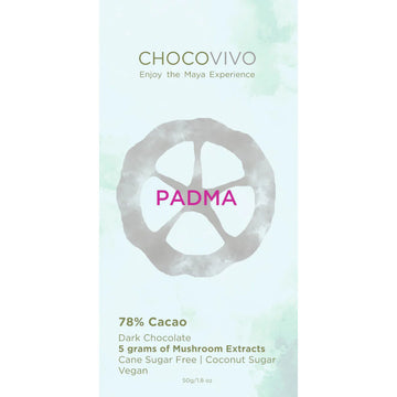 Introducing the ultimate adaptogen craft chocolate bar, the Padma! Crafted to support stress relief and boost your immune system, ChocoVivo's carefully selected ingredients include Ashwagandha, Reishi, Lions Mane, and Chaga mushrooms. Whether you're looking for an on-the-go meal replacement or a fulfilling snack, savor the deliciously healthy and satisfying earthy taste of this Padma bar.