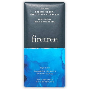 Firetree's premium 40% volcanic milk chocolate. Crafted with ethically and sustainably sourced cacao beans from Solomon Islands, Guadalcanal. Indulgently creamy with lingering caramel and mild citrus notes. Gluten-free, soy-free and Kosher certified. Firetree Chocolate selects beans from remote volcanic islands, renowned for their rich soil, resulting in uniquely flavored chocolate. Utilizing single estate cacao, each bar boasts distinct flavors, epitomizing Firetree's commitment to quality and craftsmanship.