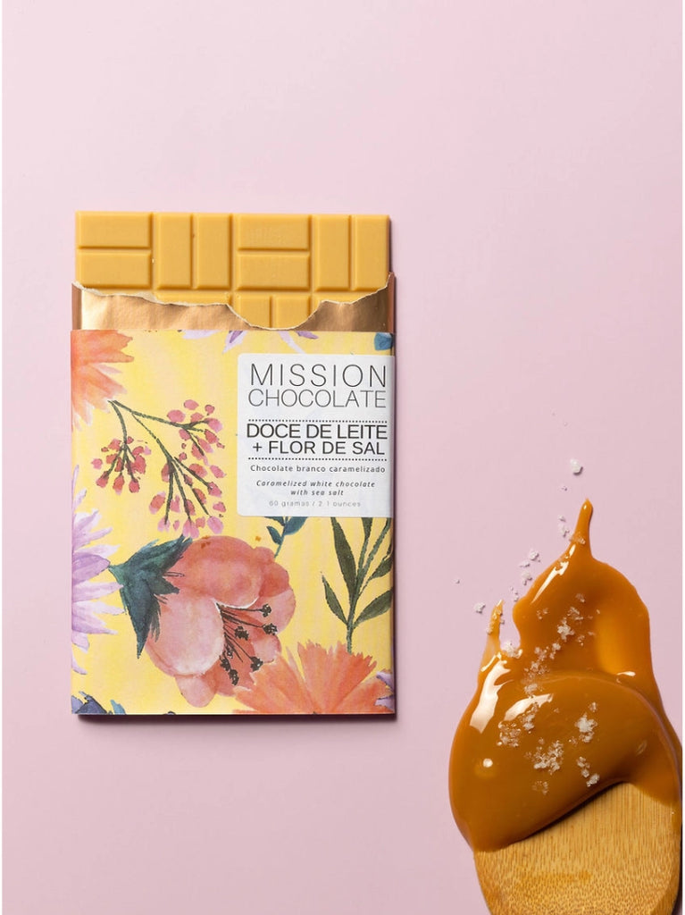 This delicious caramelized white chocolate bar is sprinkled with Brazilian sea salt.