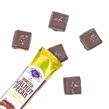 Indulge in the epitome of gourmet chocolate with Vosges-Haut's 62% Cacao Dark Chocolate Marshmallows infused with Roasted Walnut Pecans & Caramel. Each marshmallow is meticulously hand-topped with a luscious square of soft, buttery caramel, enveloped in decadent dark chocolate, and elegantly adorned with a generous sprinkle of roasted walnuts and pecans.
