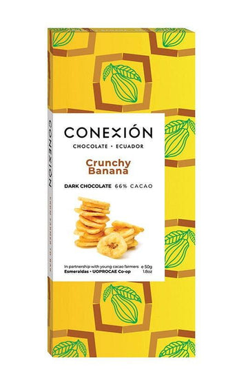 Sweet bananas grow amongst the cacao plantations, so blending these compatible flavors couldn’t feel more right. Chocolate and banana is a classic Ecuadorian combination, most often served as a refreshing frozen banana dipped in chocolate. They’re sure you’ll love this chocolate bar form of one of their favorite treats.