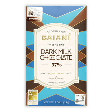 Baianí's Dark Milk Chocolate Bar contains 57% cacao beans with an additional 7% cacao butter, enabling the cacao's inherently smooth caramel flavors to shine through. It's a bit different from other milk chocolate bars since there is not a lot of sweetness revealed overall. But it brings hints of sweetness similar to caramel, cereal, hazelnut, and honey.
