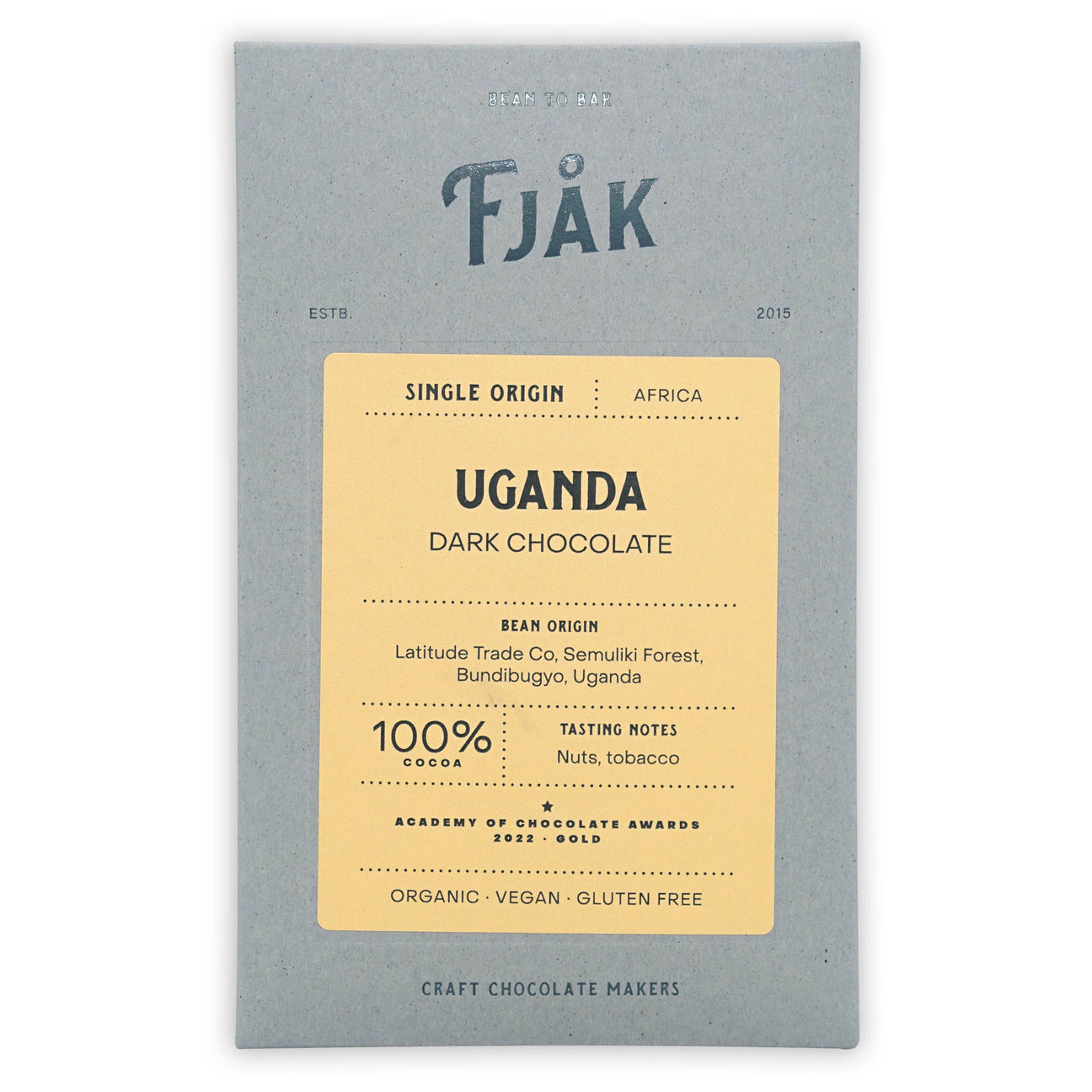 Taste Fjåk's award-winning premium and intense 100% pure dark chocolate with tasting notes of nuts and tobacco, which is also certified EU organic and vegan friendly. Perfect for the health conscious connoisseur. This bar won the Academy of Chocolate Award Gold in 2022!