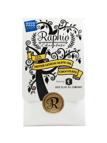 Raphio’s Olive Oil Chocolate Bars are made with Earth‘s finest ingredients: ethically sourced cacao beans from around the world and Recchiuti Family Farms’ award-winning estate grown ENZO organic extra virgin olive oil. Smooth, silky, decadent and unique, infused with real fruit crush - with all the healthy antioxidant benefits of dark chocolate and freshly milled olive oil - makes this the perfect heart-friendly indulgence.