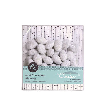Charles Chocolates' premium California almonds are roasted darker, then coated in bittersweet and mint infused white chocolates and dusted in powdered sugar.