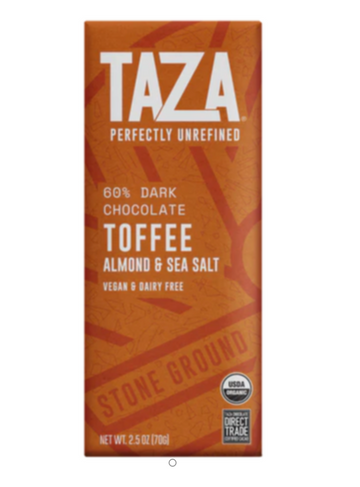 Perfectly unrefined 60% dark stone ground organic chocolate with a trifecta of tasty: toffee, almonds, and sea salt. Amaze Bars take stone ground chocolate to another dimension by pairing incredible flavor experiences with Taza's minimally processed, bold dark chocolate.