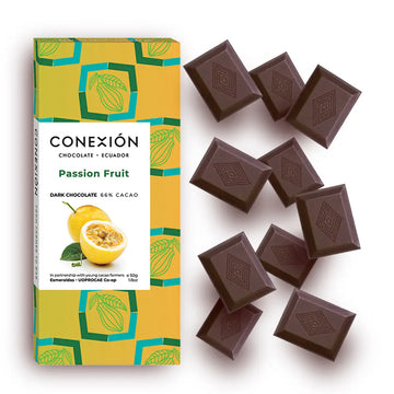 The bright tropical flavors of passion fruit are the perfect addition to Conexión's 66% chocolate made with heirloom Nacional cacao. It’s a true taste of Ecuador, where both passion fruit and cacao thrive. Their chocolates are made with cacao sourced from Ecuadorian farmers they know and love, and made from bean-to-bar in the country of origin.
