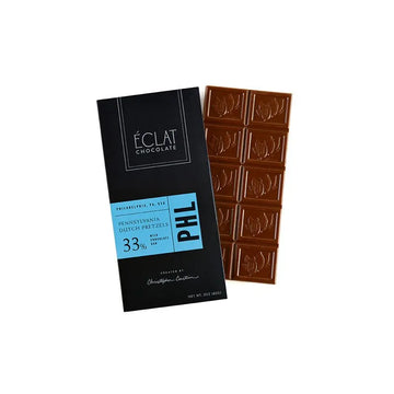 Éclat's quest to improve the chocolate-covered pretzel has brought them to an addicting discovery. Inspired by the historical Pennsylvania Dutch Swiss and German immigrants who introduced the pretzel to America in the 1800s, this Destination Bar is a 33% milk chocolate blended with Lancaster County pretzels.